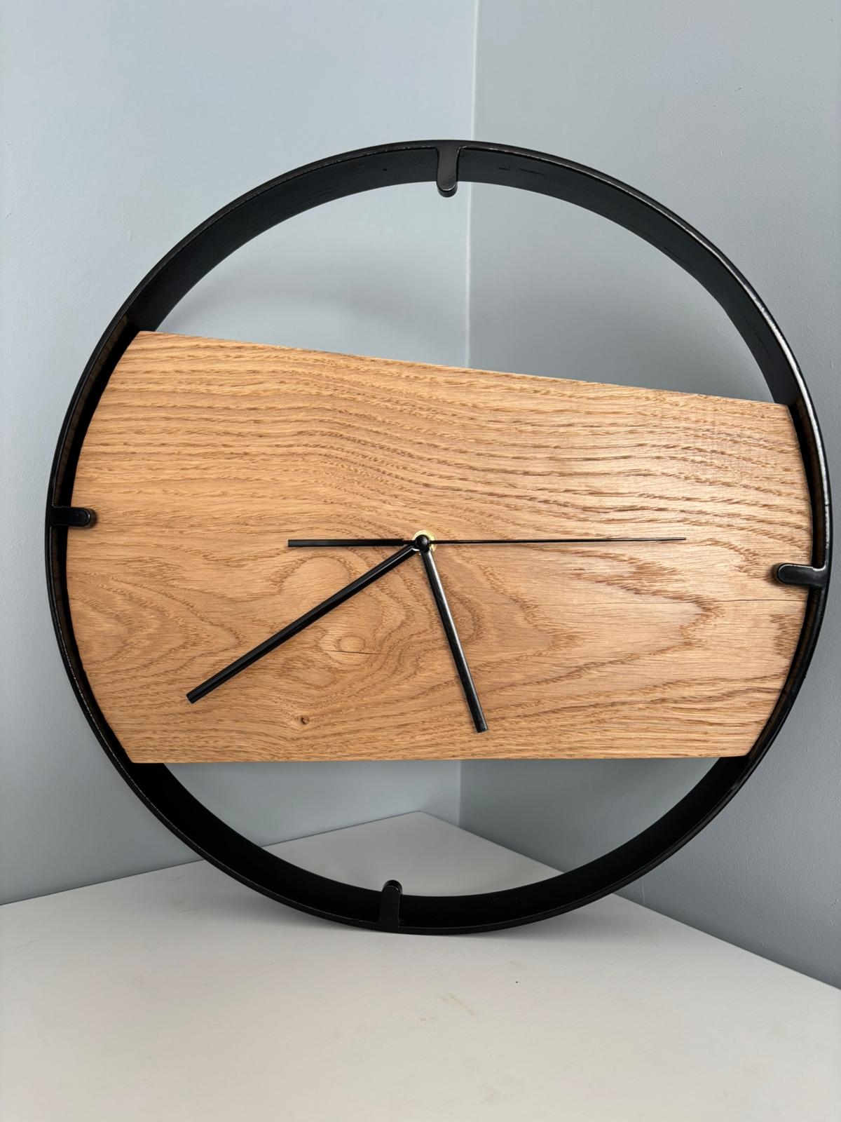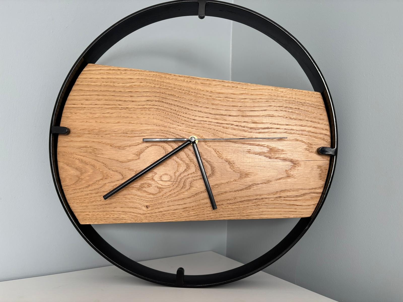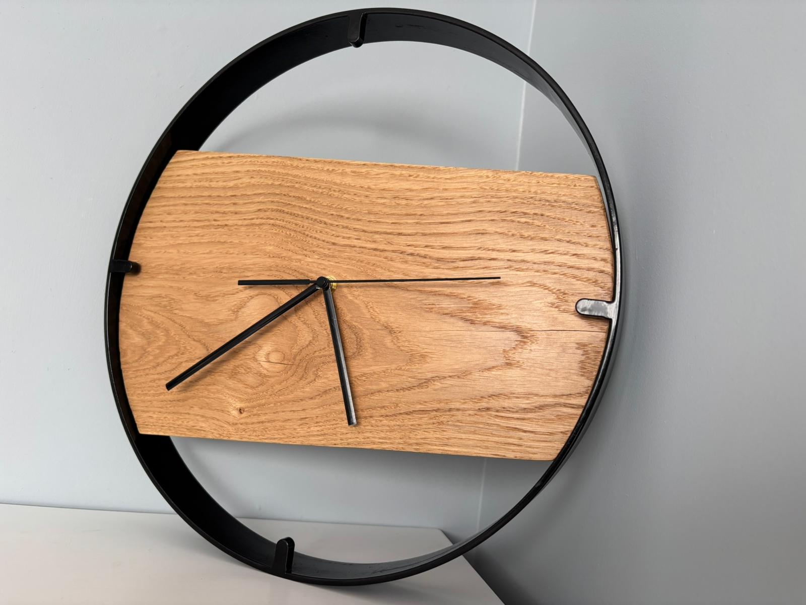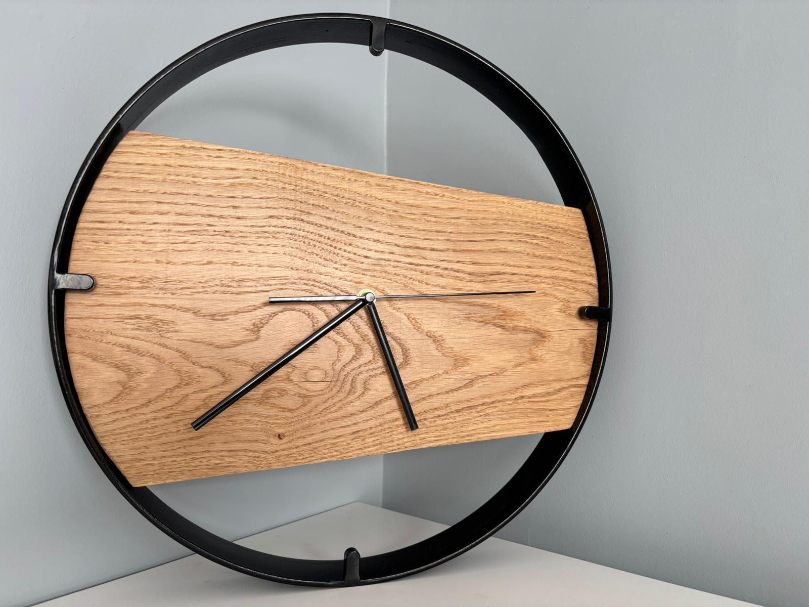 Każdy drewniany zegar ścienny w metalowej ramie Driftwood powstaje w procesie rzemieślniczym z