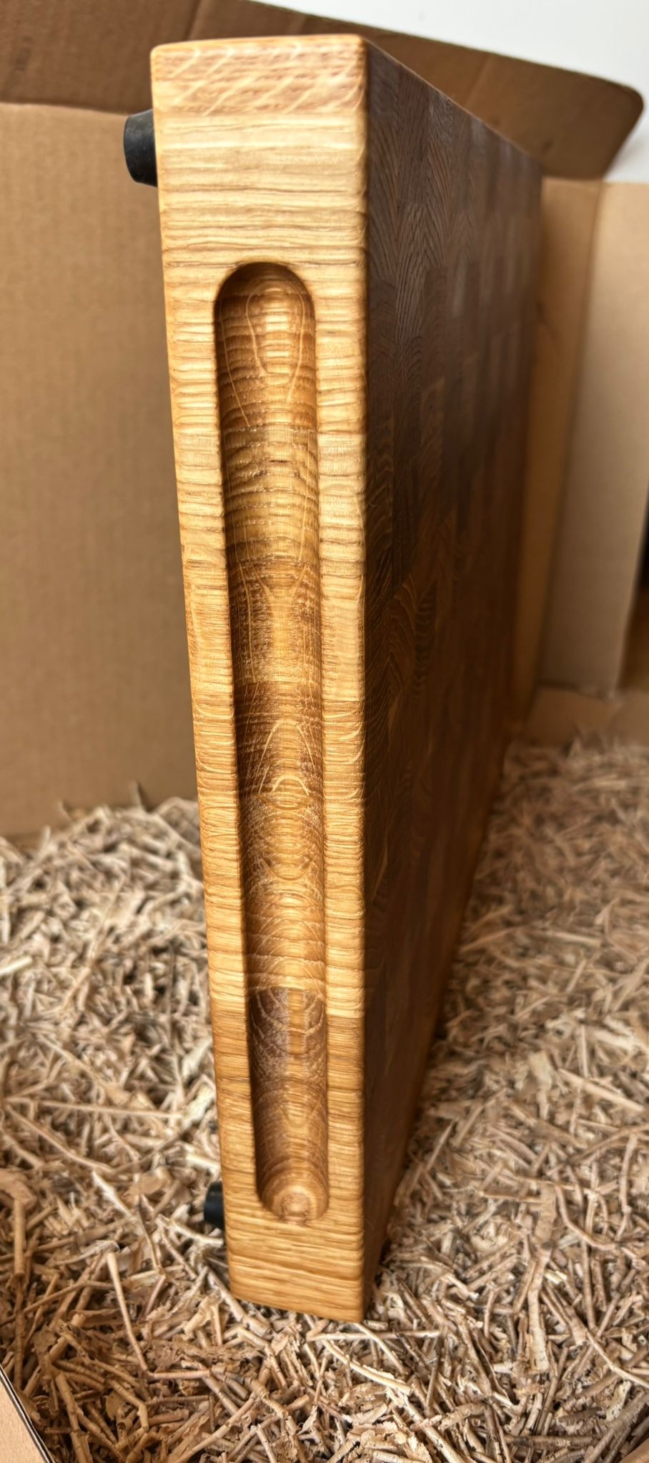 Dąb słynie z twardości, odporności na uszkodzenia i szlachetnej, ciepłej barwy, a układ sztorcowy sprawia, że ostrze noża wnika między włókna drewna, a nie je przecina — dzięki czemu deska jest wyjątkowo odporna na ślady krojenia i przyjazna dla noży.