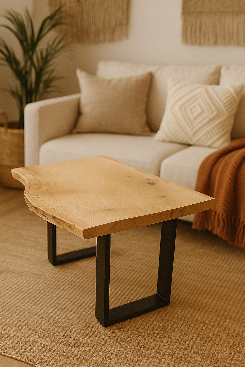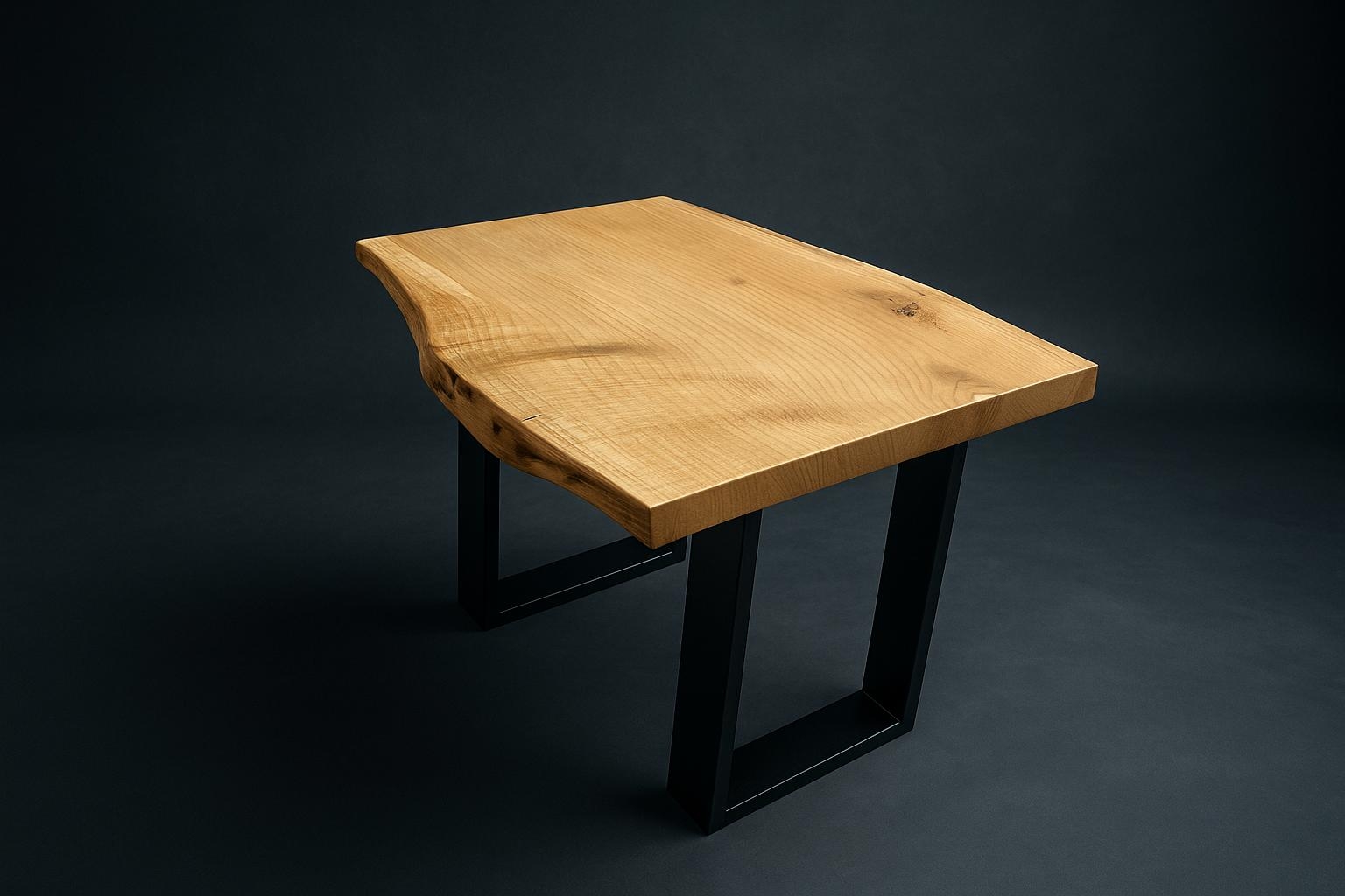 Czarne, metalowe nogi doskonale kontrastują z ciepłem naturalnego drewna. To połączenie surowości i elegancji sprawia,