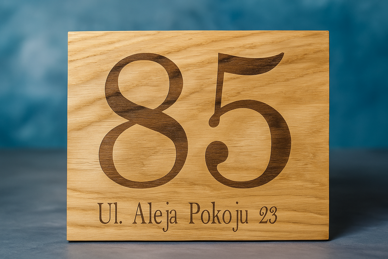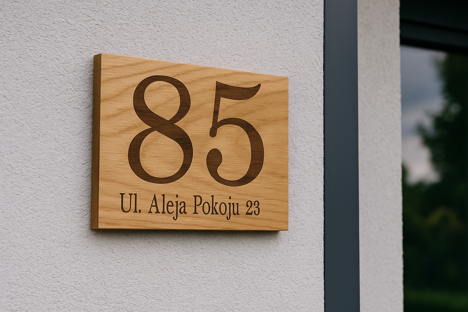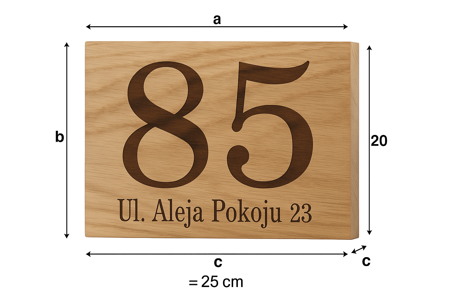 Wykonana z solidnej, dębowej deski, stanowi czytelne oznaczenie numeru domu, nazwy ulicy lub
