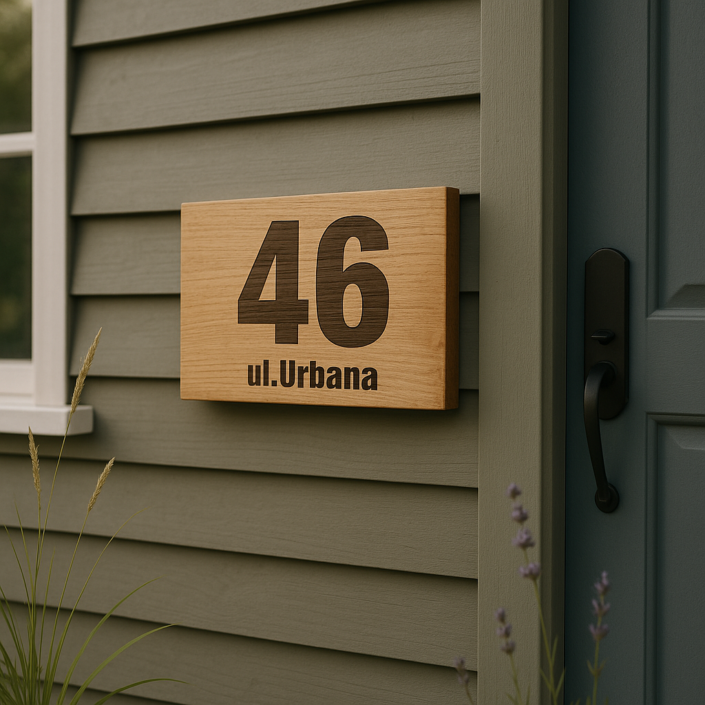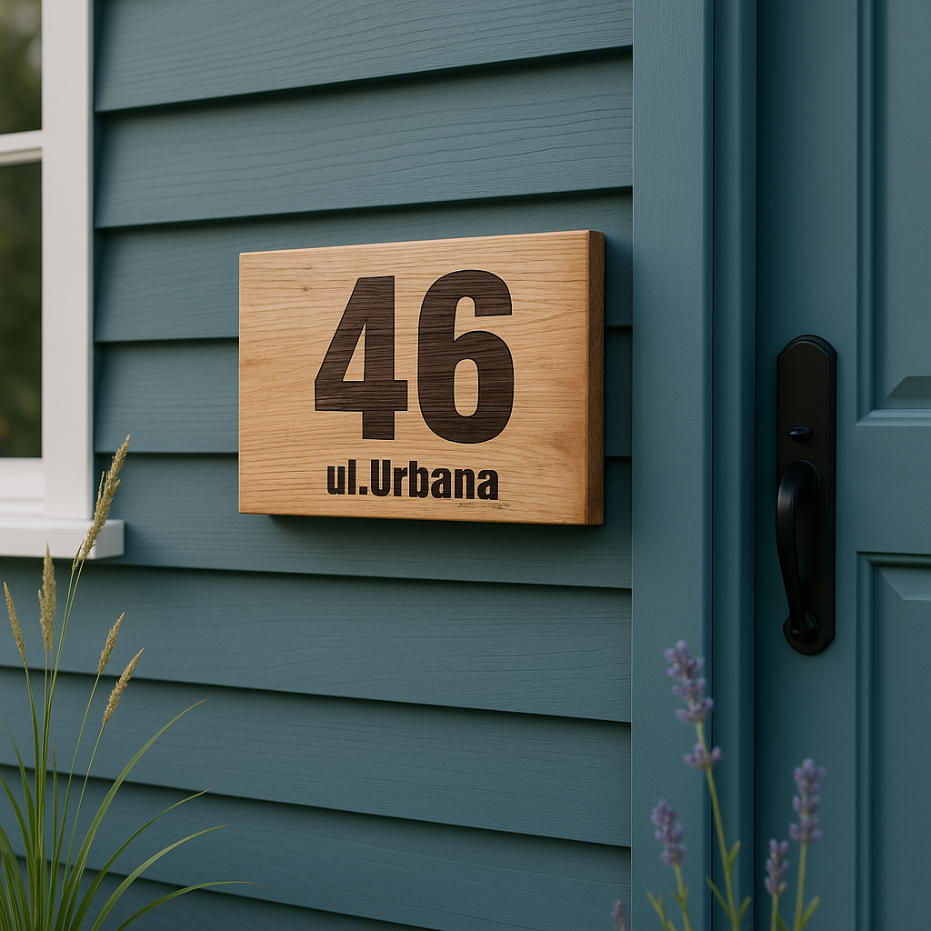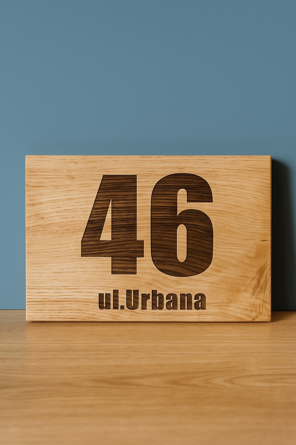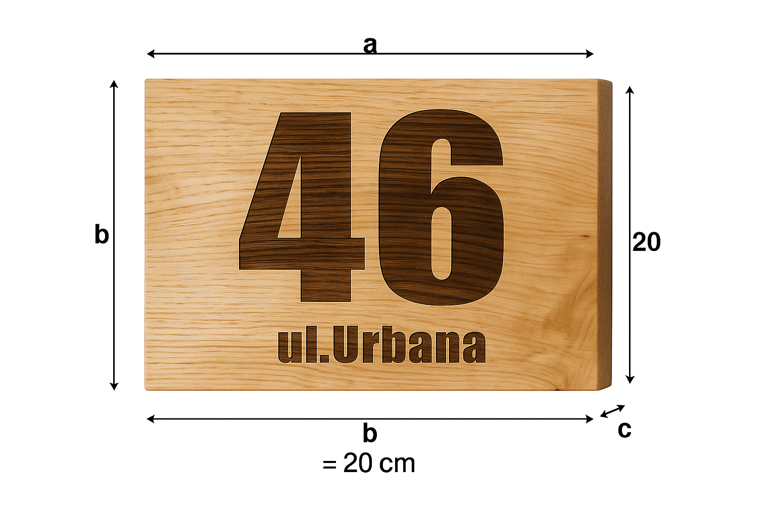 Tabliczka Adresowa z Numerem Domu Podkreśl wyjątkowy charakter swojej posesji dzięki dębowej tabliczce adresowej. Wykonana z wysokiej jakości drewna dębowego, tabliczka zachwyca klasycznym wyglądem oraz precyzyjnym wykończeniem grawerowanych napisów. Wymiary: A Szerokość : B: Długość : C: Grubość : Cechy grawerowanej tabliczki : Naturalne drewno dębowe: Dzięki widocznym słojom i solidności, lite drewno dębowe gwarantuje trwałość i naturalne piękno przez wiele lat. Precyzyjny laserowy Grawer Subtelne zdobienia: Sfazowane kanty pod kątem 45 stopnia , idealne wykończenie Uniwersalność montażu: Tabliczka doskonale pasuje na ogrodzenie, bramę lub elewację budynku.