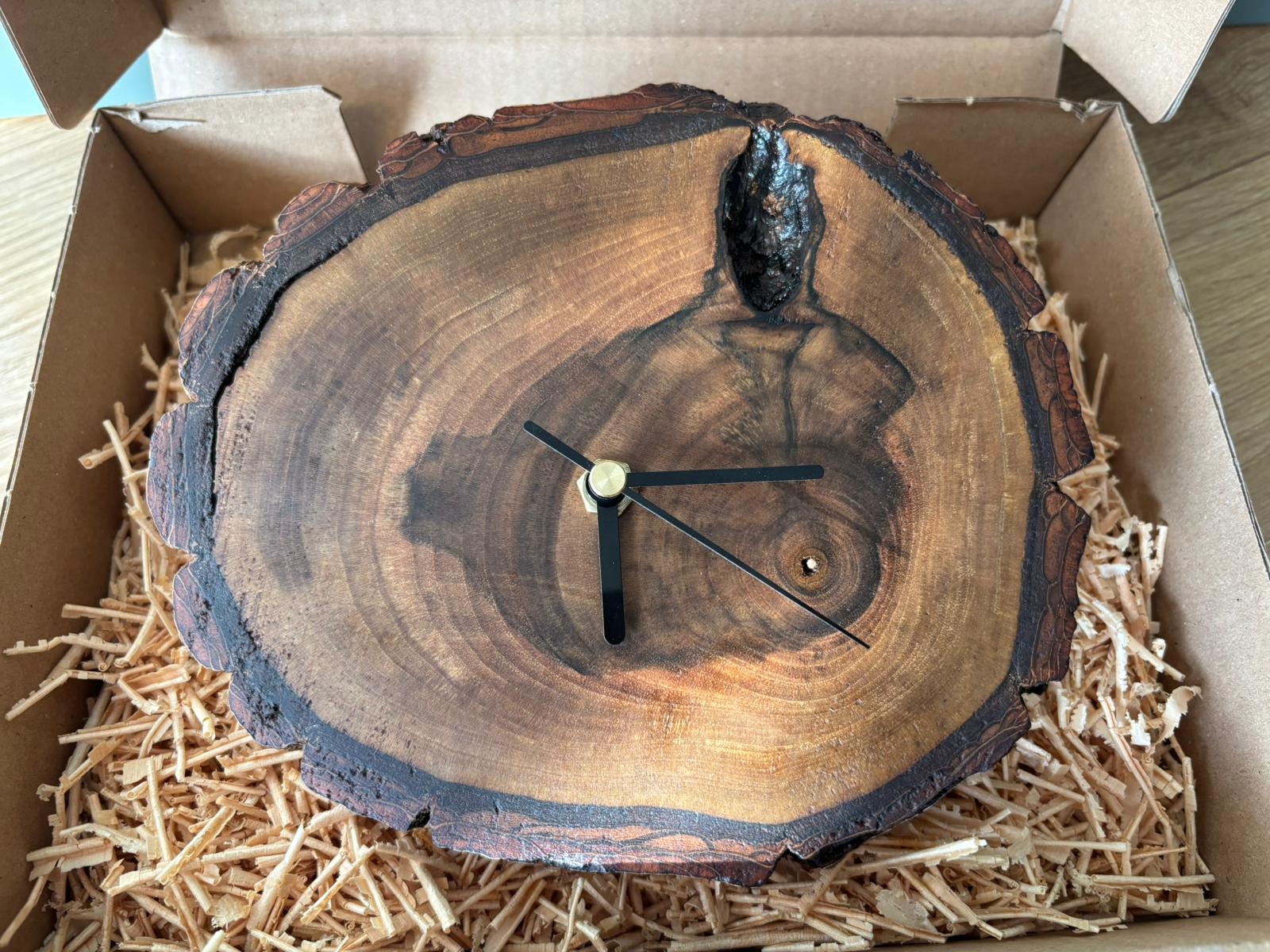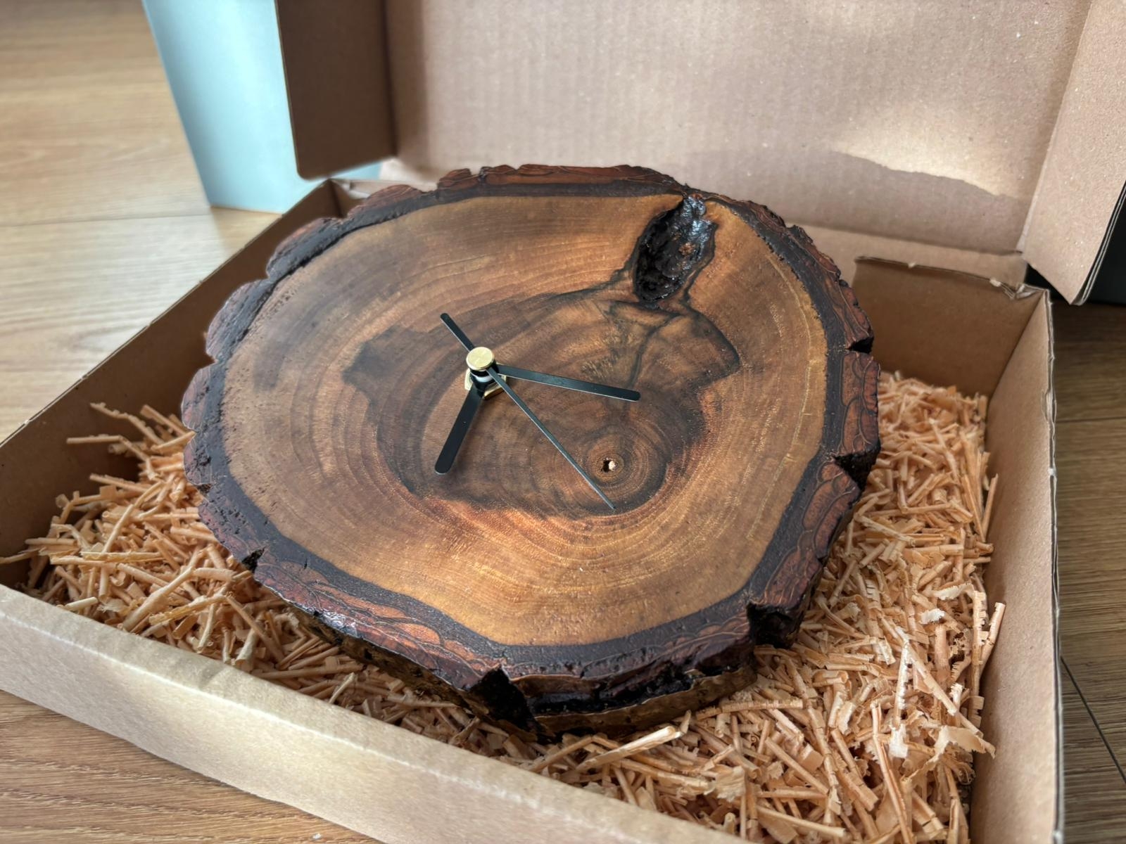 Zegar z plastra drewna Driftwood pakujemy z wyjątkową starannością — tak, aby już samo otwarcie