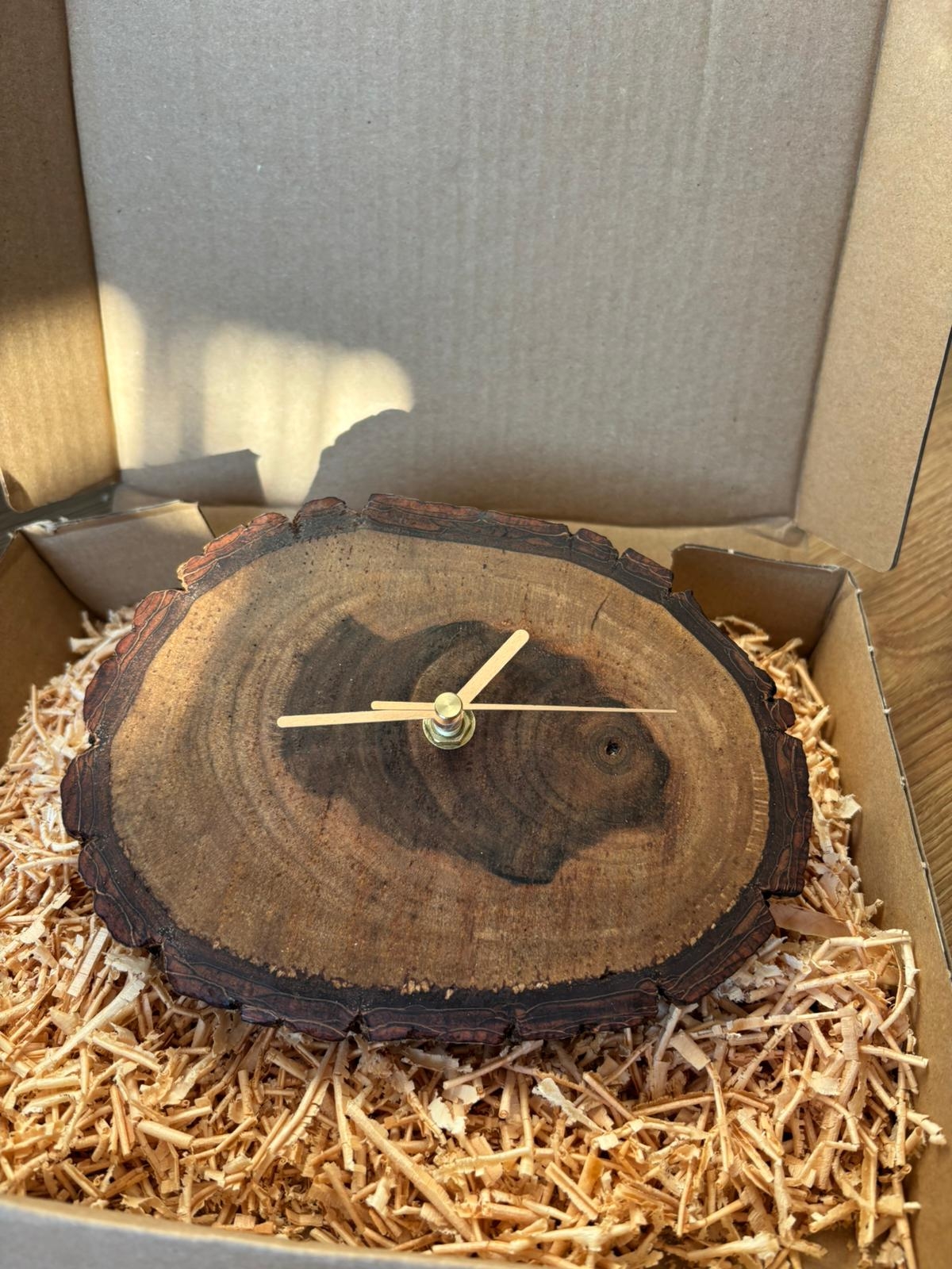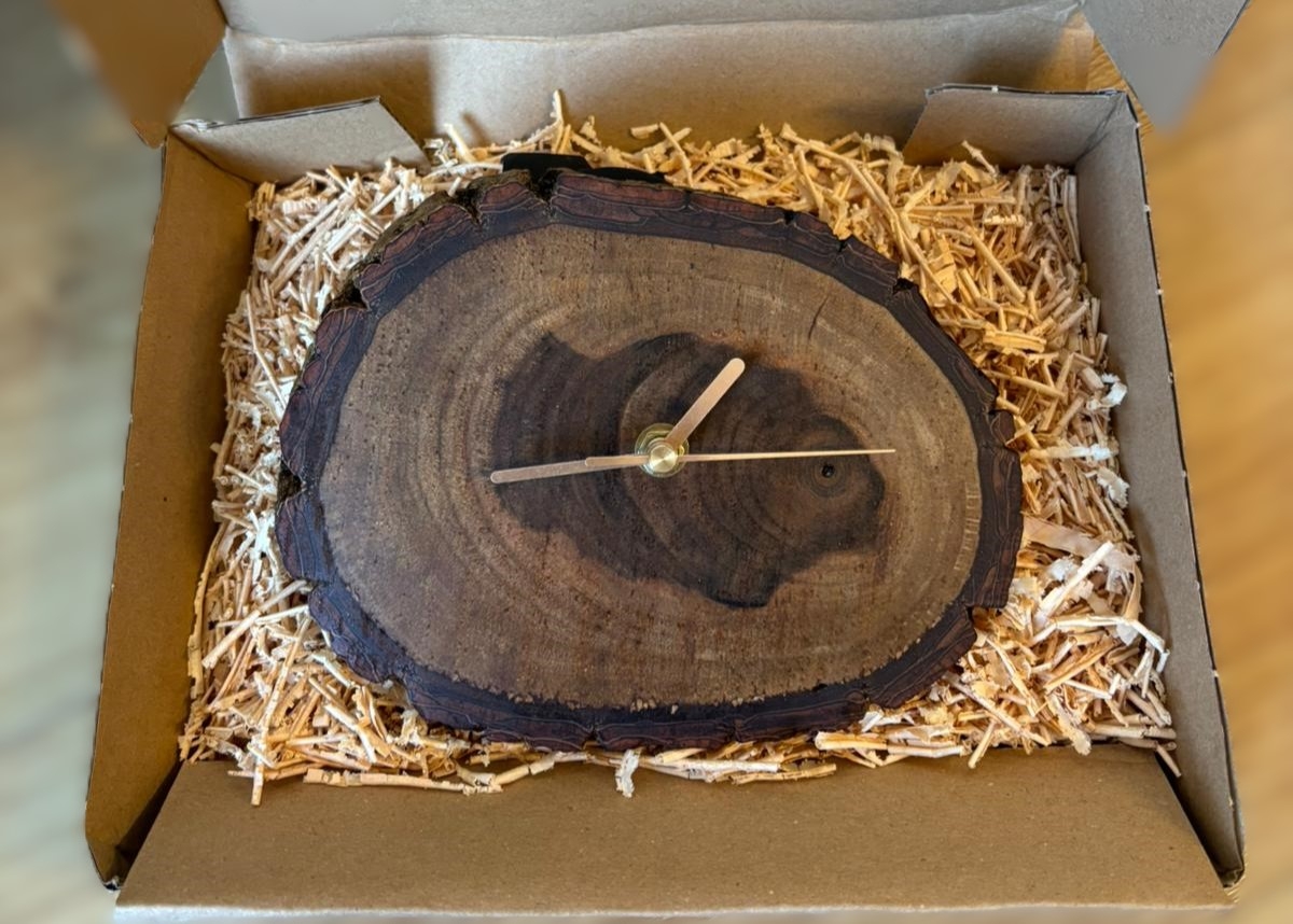 Zegar z plastra drewna Driftwood pakujemy z wyjątkową starannością — tak, aby już samo otwarcie