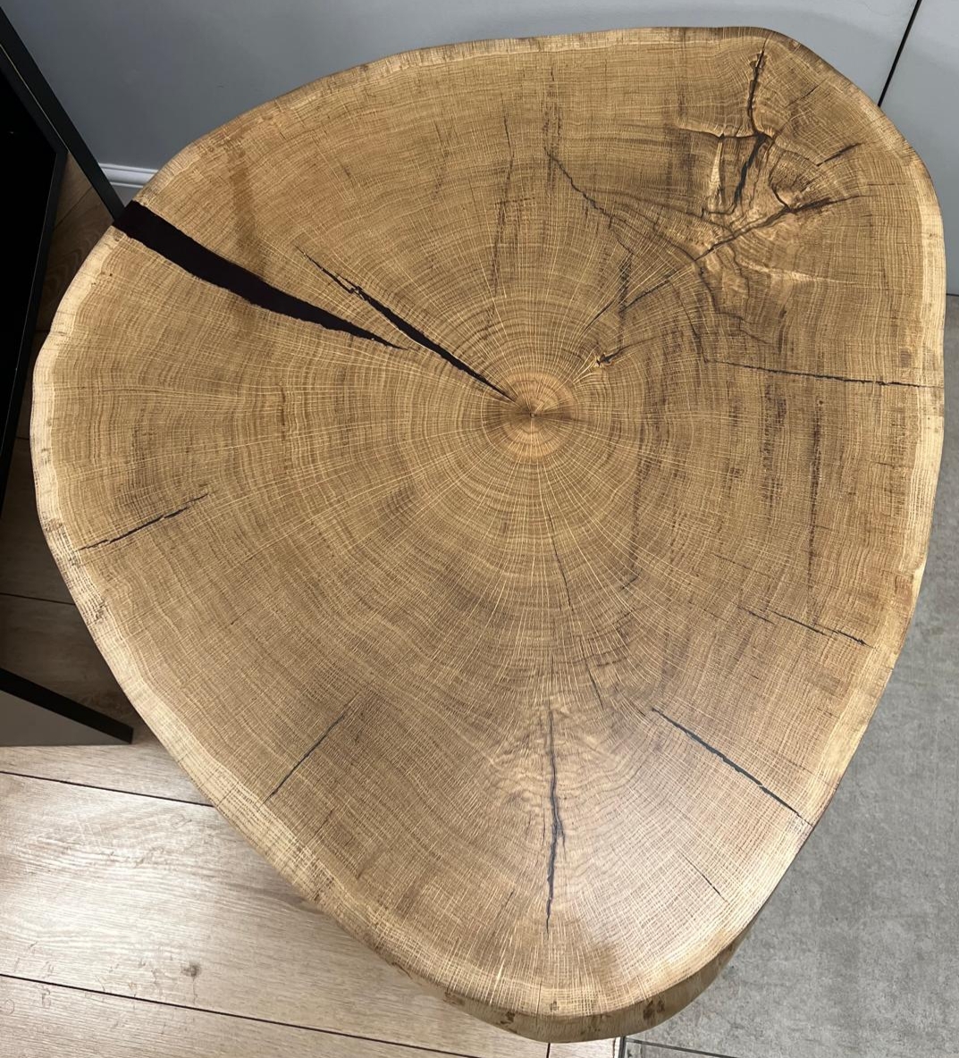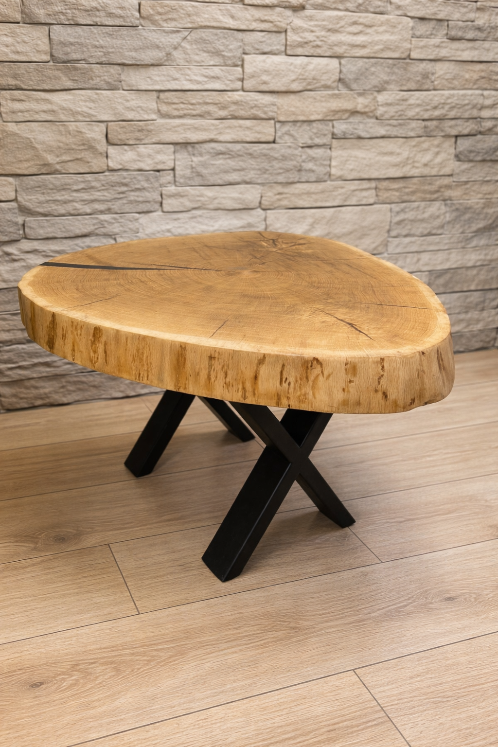 Każdy stolik powstaje z unikatowego plastra drewna – nie istnieją dwa identyczne egzemplarze. Różnią się usłojeniem, kształtem oraz układem zalania żywicą, co czyni każdy z nich prawdziwym unikatem.