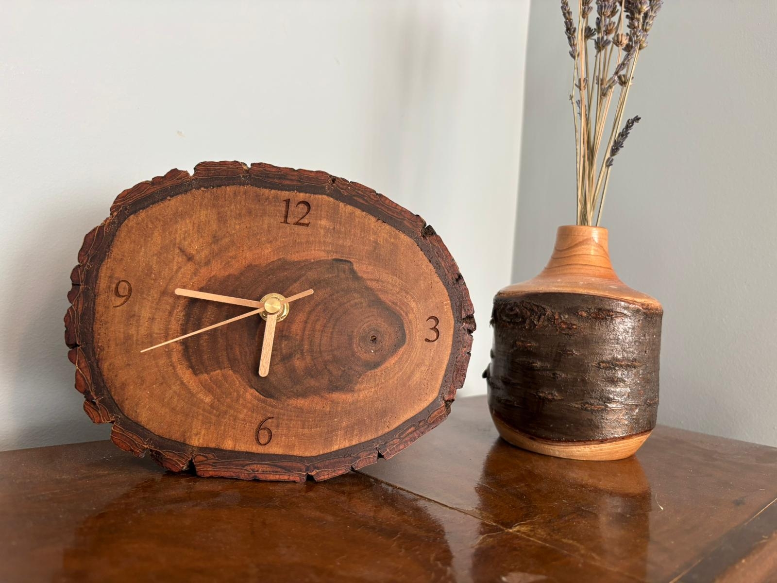 Zegar z plastra drewna orzecha Driftwood powstaje w procesie rzemieślniczym z drewna