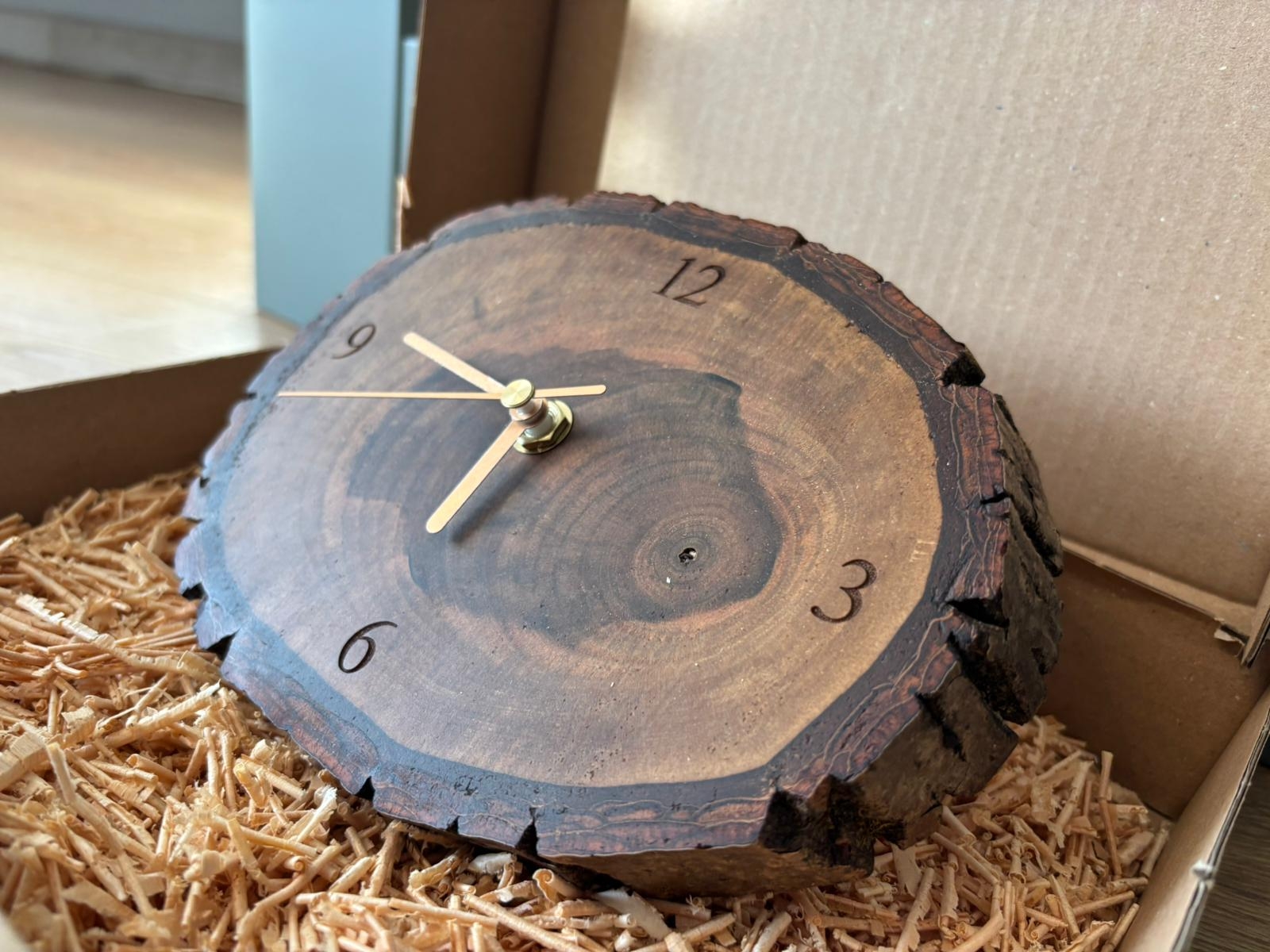Zegar z plastra drewna Driftwood pakujemy z wyjątkową starannością — tak, aby już samo otwarcie